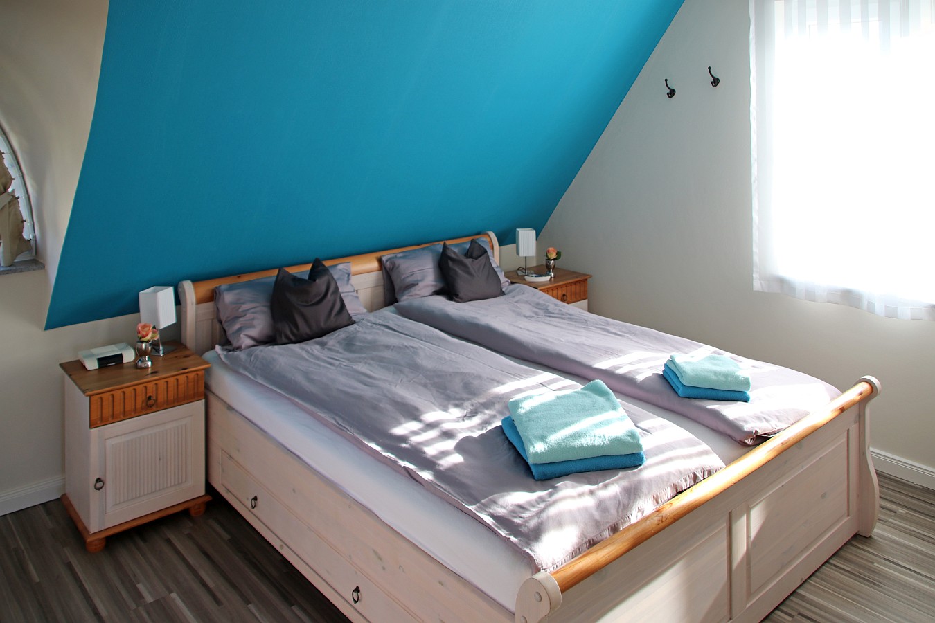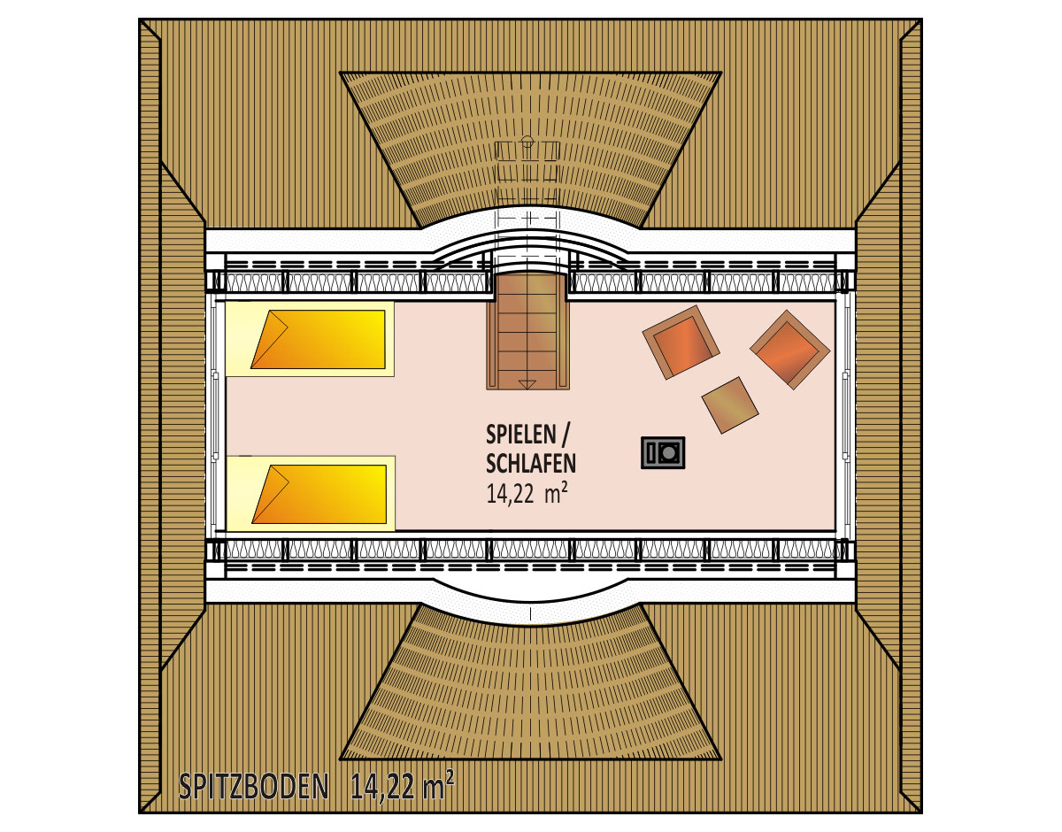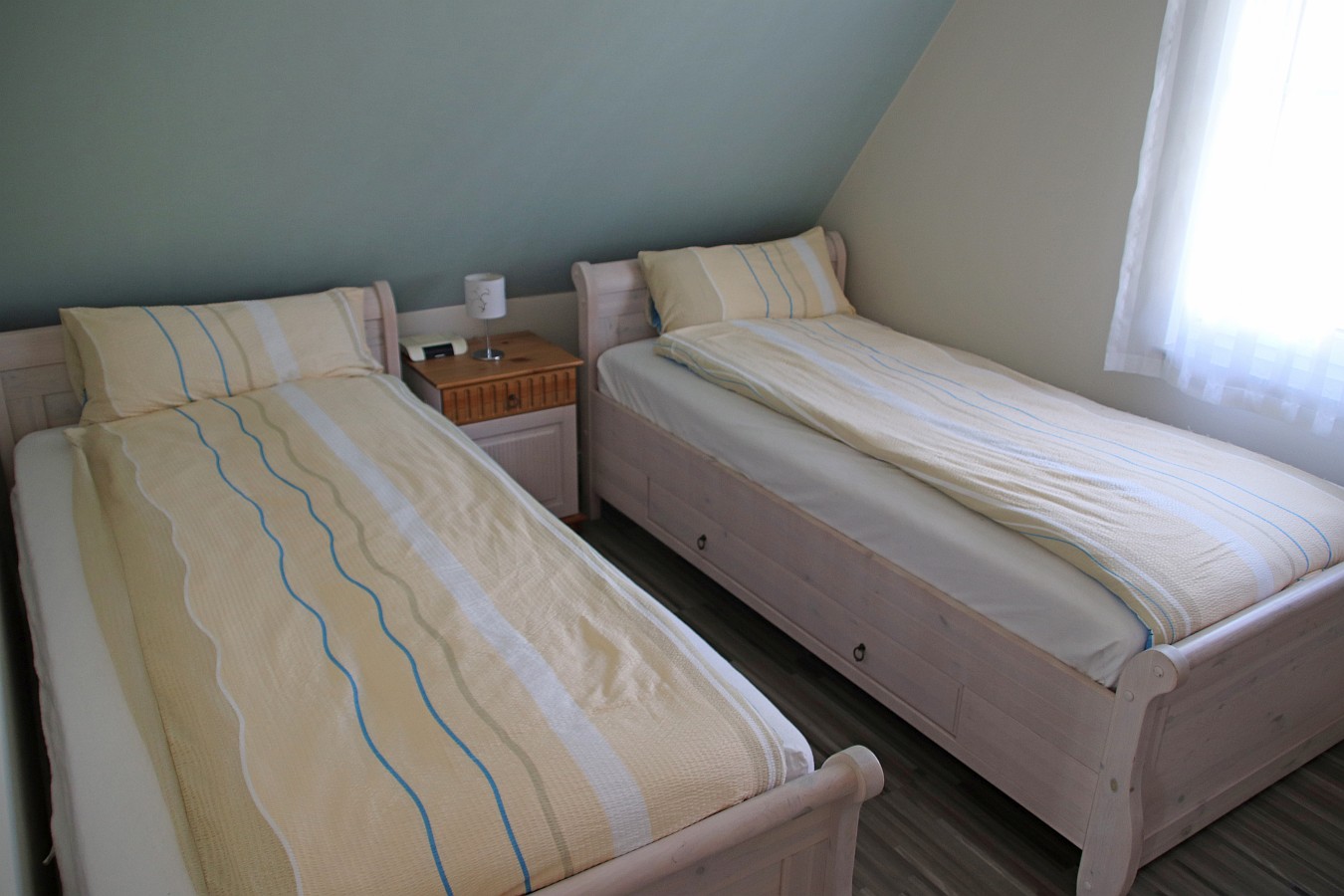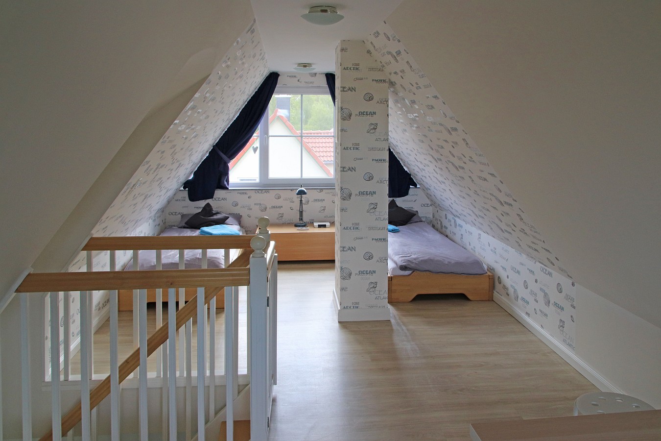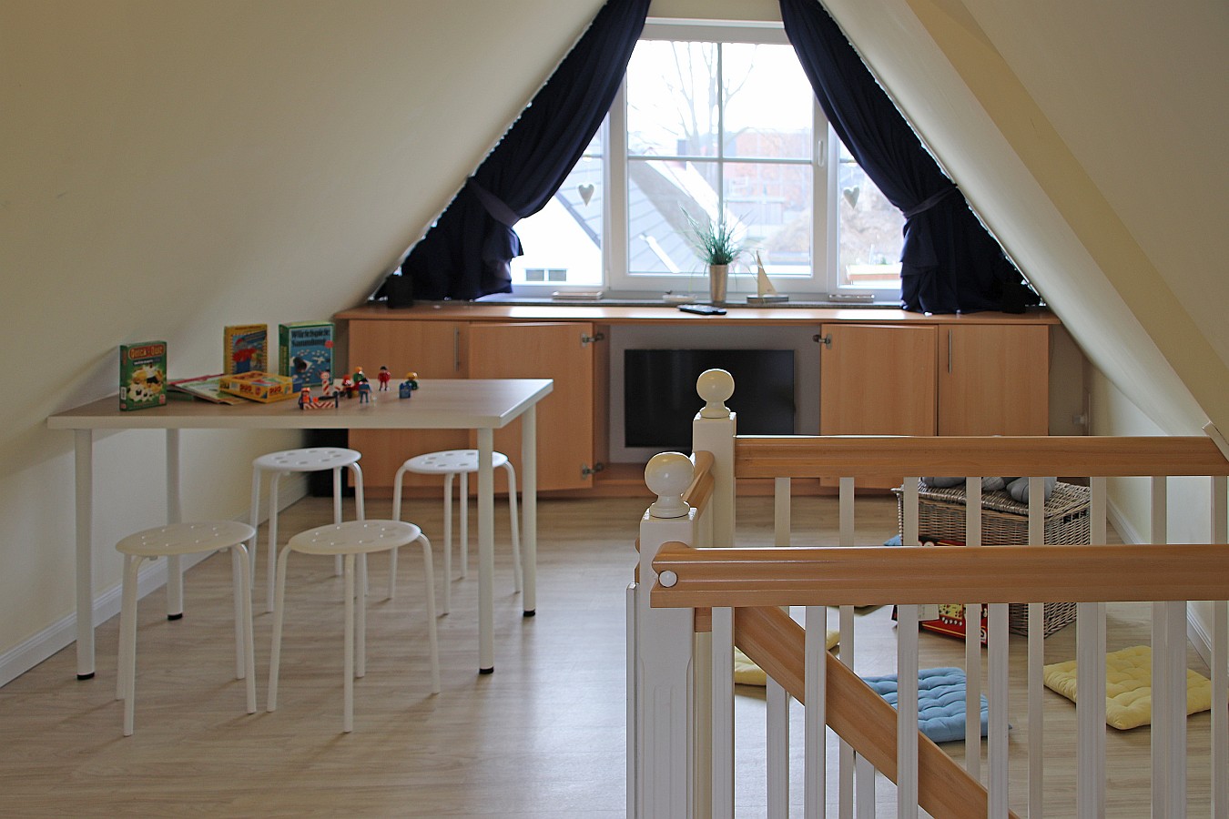 Im ausgebauten, lichtdurchfluteten Dachgeschoss befindet sich ein exklusiver, großer Raum mit 2 Einzelbetten und einer Spielecke mit Spielen und Kinderbüchern. Zusätzlich befindet sich hier ein LCD-Fernseher mit BluRay-Sstem, Radio und Apple Dock. Damit auch unsere kleinen Gäste sicher spielen können, verfügt die Treppe des Dachgeschosses über ein Treppenschutzgitter.