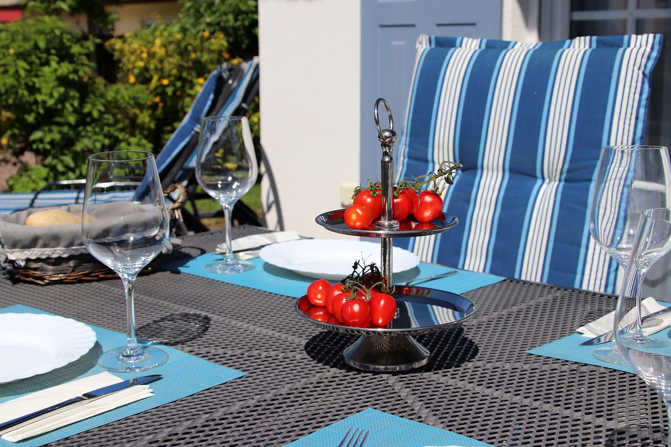 - 8 Gartenstühle, 2 Gartentische, 2 Sonnenliegen, 2 Sonnenschirme, Grill