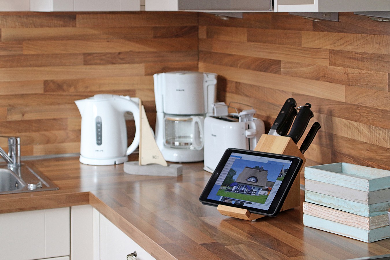 - eine vollständig ausgestattete Küche, Backofen mit Ceranfeld, Geschirrspüler, Mikrowelle, großer Kühlschrank mit Eisfach, Kaffeemaschine, Kaffeevollautomat, Toaster und Wasserkocher, alle notwendigen Utensilien und viele Extras (z.B. Espressokocher, Kindergeschirr, Kinderbesteck, Waffeleisen und und und)
