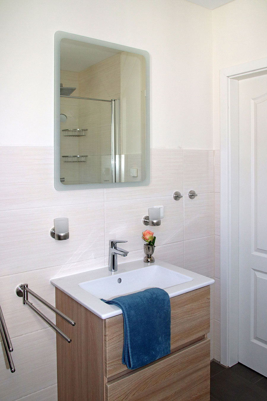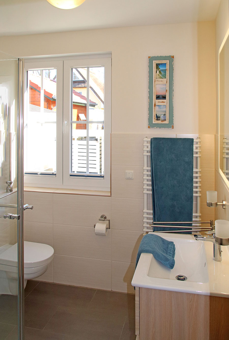 - ein gemütliches Badezimmer mit Waschbecken, Dusche, WC und ausreichend Abstellmöglichkeiten